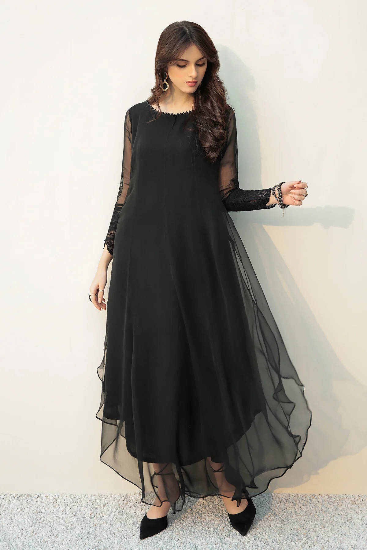 This two-piece set features a chiffon frock with embroidered sleeves and grip trousers. It is complete with accessories and an optional style guide to layer the outfit with some chunky ethnic jewelry for extra drama.