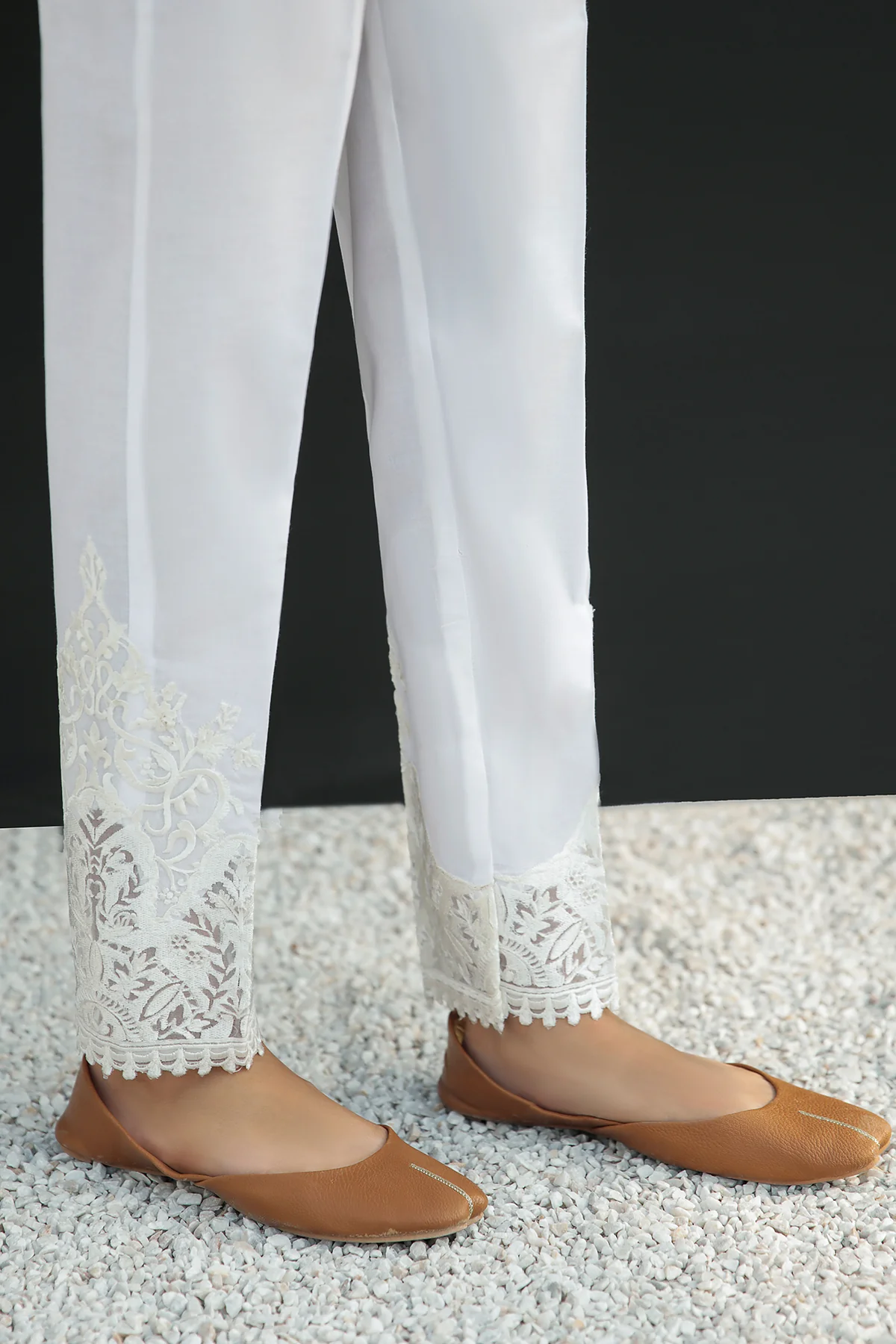 The embroidered trouser is crafted from a 100% cotton fabric. The model wears a size small.