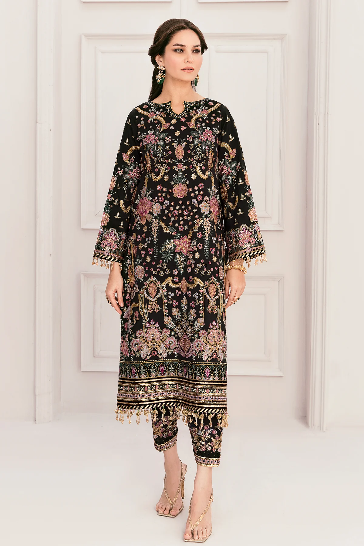 Presenting our 3-piece black-coloured silk ensemble. The shimmering embroidery all over the shirt bestows an ornamental look. The accents of floral patterns create an ethereal vista, while the embellishments of silk, organza and velvet patches elevate the overall outlook. The shirt is paired with embroidered raw silk trousers. The dupatta, adorned with proficiently crafted embroidery, adds a finesse touch.